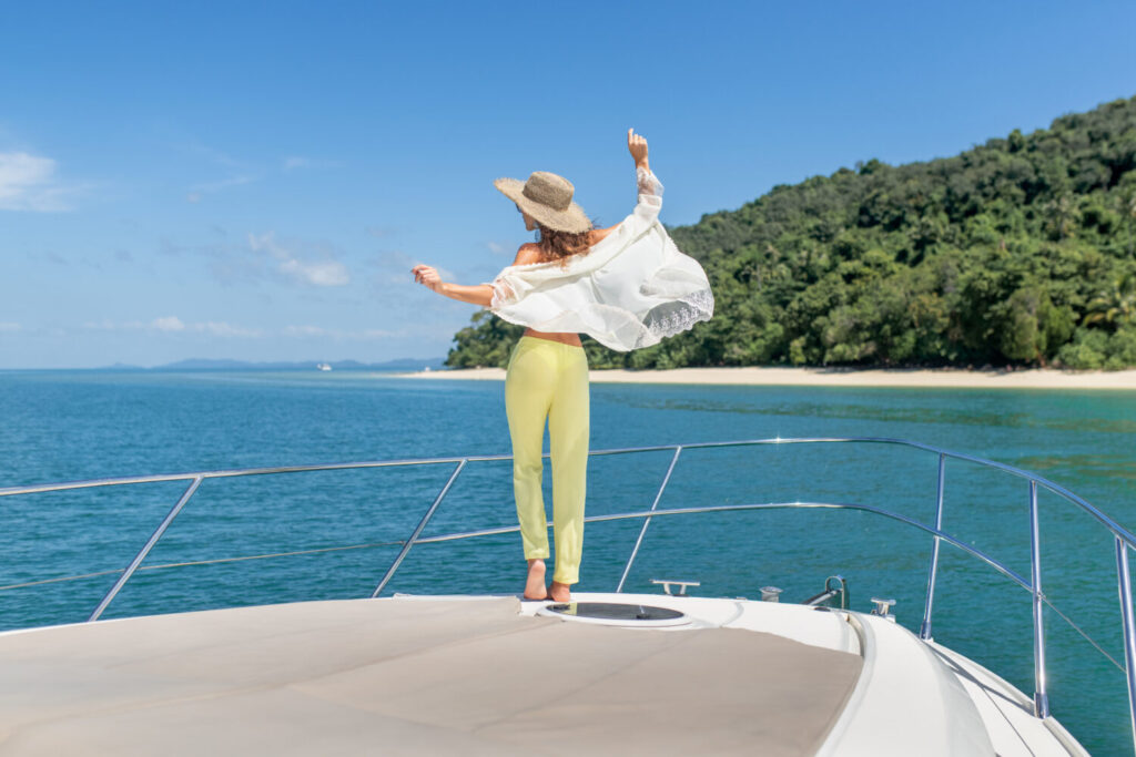 Vista posterior: Imagen al aire libre de una adorable joven con traje de verano en un yate, mirando a un hermoso paisaje natural durante el viaje. Mujer feliz disfrutando de viajes de verano.