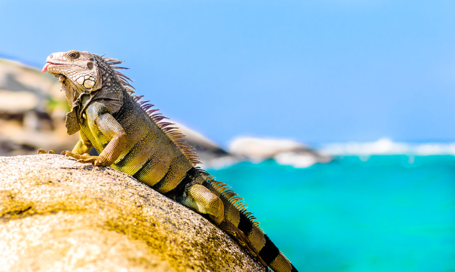 vista sobre iguana en una roca en el parque nacional Tayrona en Colombia