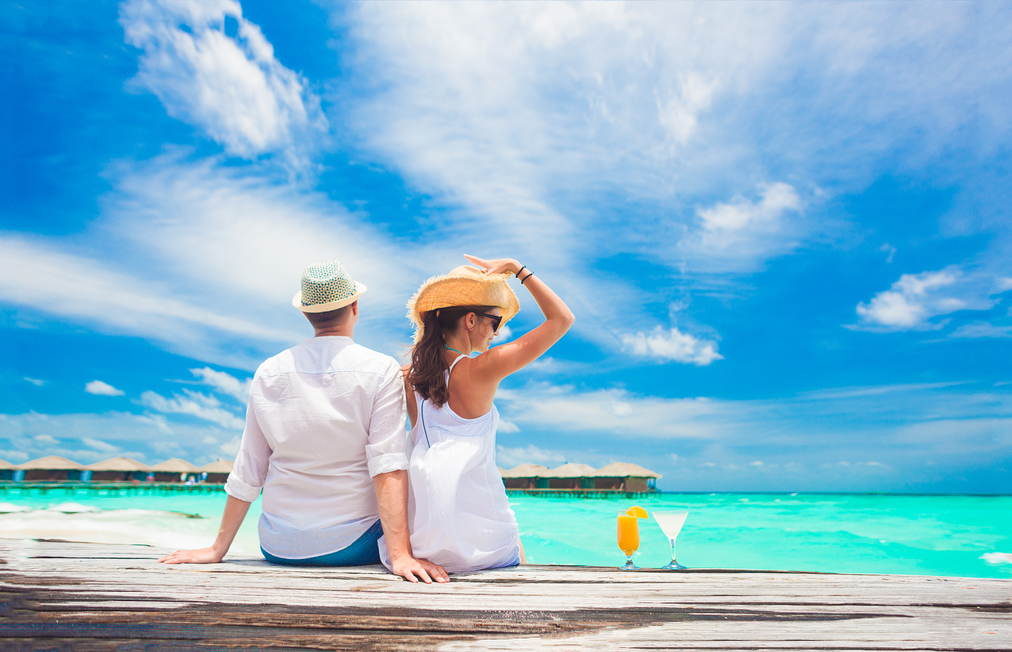 vista trasera de una pareja sentada en un puente de madera junto a una playa tropical en las Maldivas