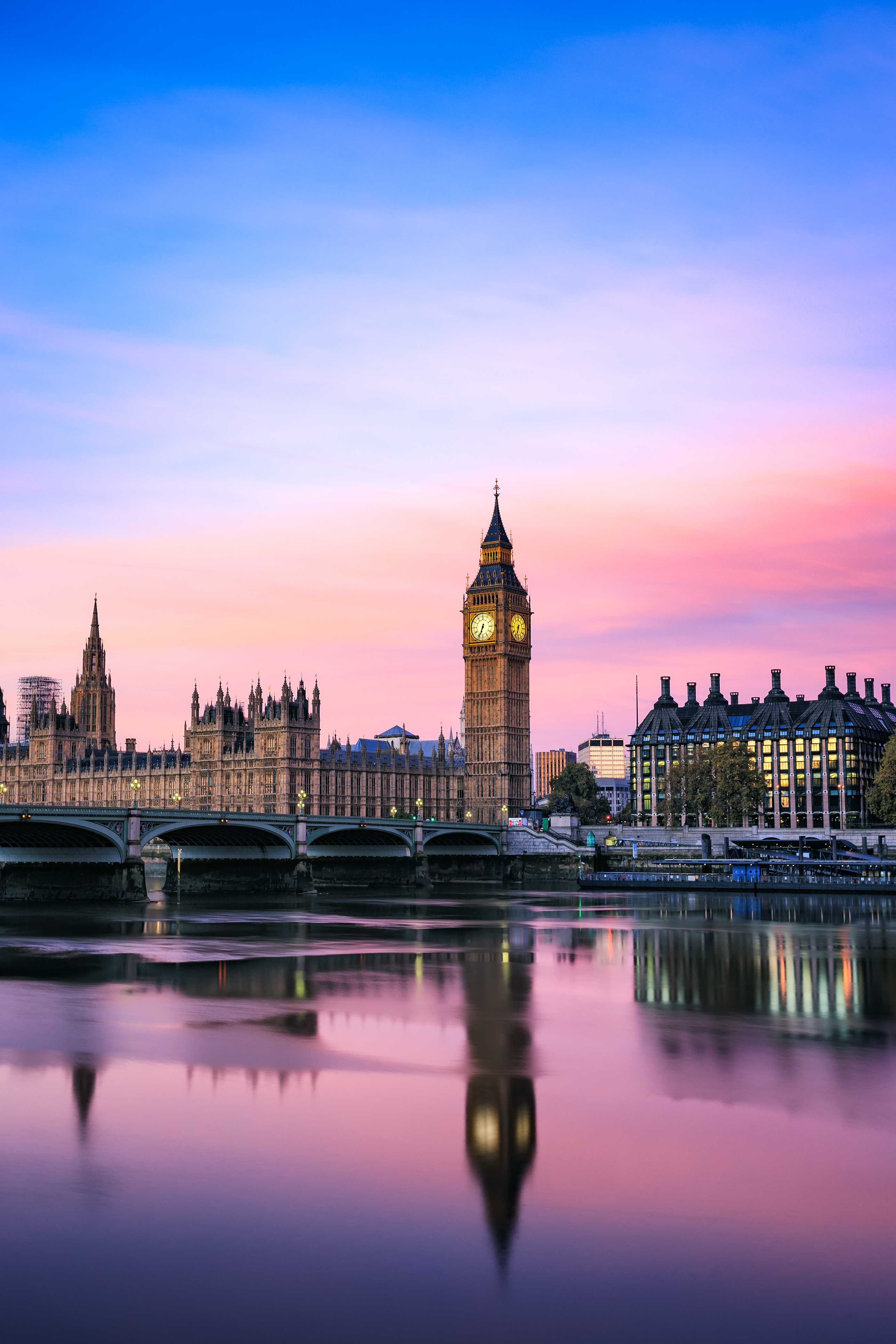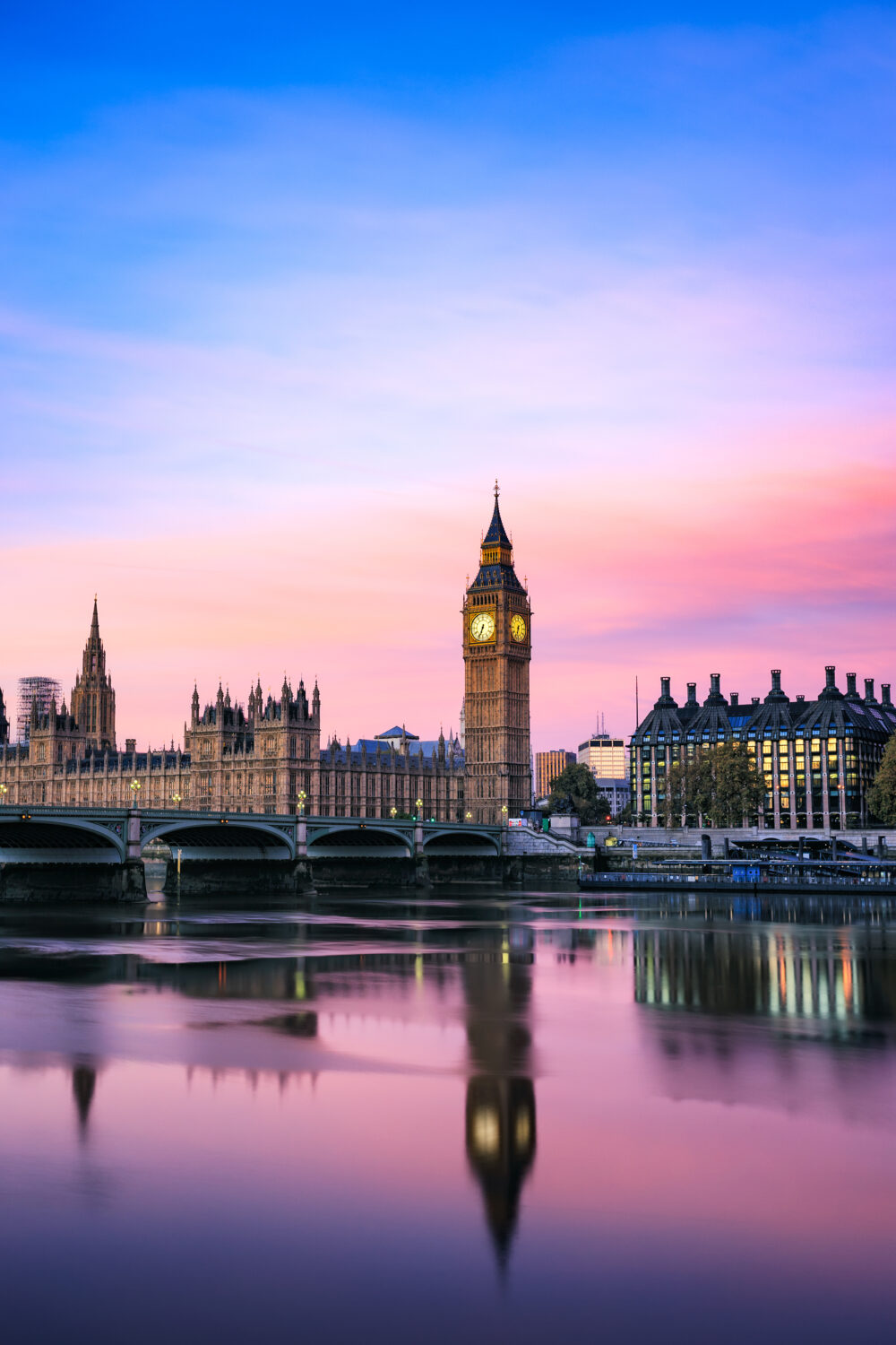 Vista vertical del Big Ben y las cámaras del parlamento al atardecer, Londres, Reino Unido.