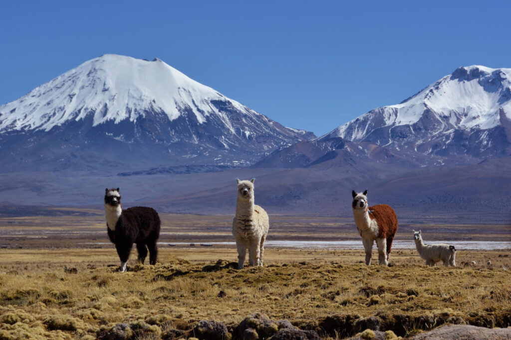 volcanes cubiertos de nieve pomerape y parinacota llamas lama glama