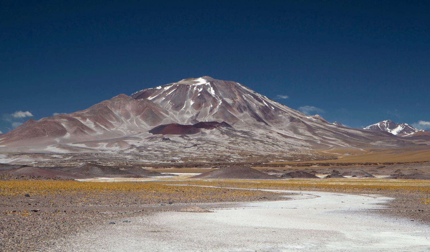 Volcanic landscape in the Andes mountain range. View of Volcano Incahuasi, the golden meadow and natural salt flat high in the cordillera in summer.