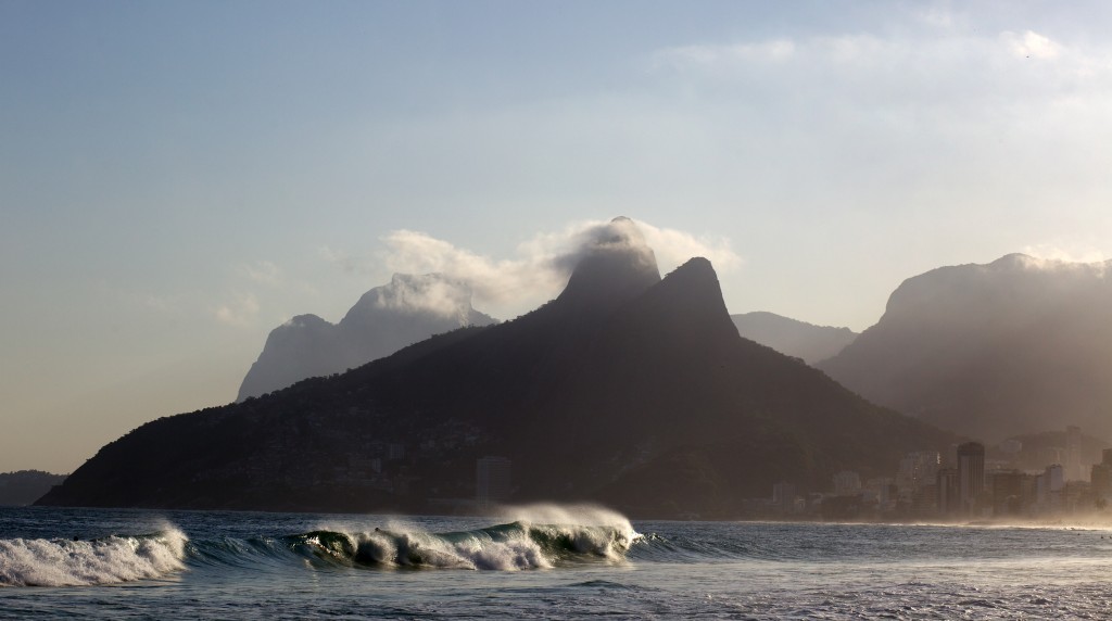 Waves crashing below a mountain at Rio de Janeiro, Brazil