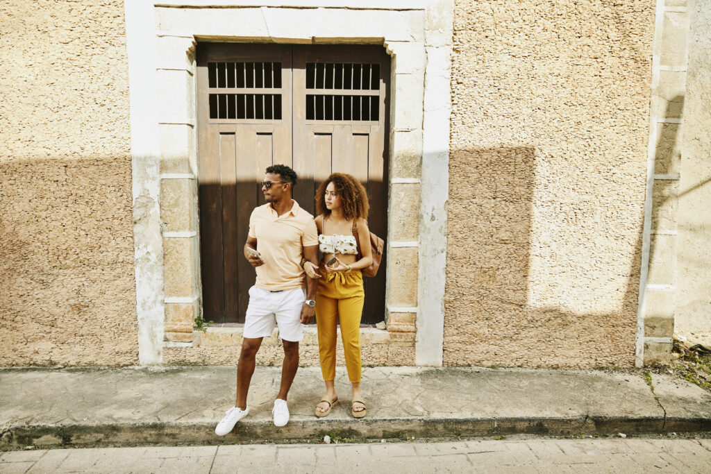 Wide shot of couple holding smart phones and standing curbside while waiting for ride during vacation ID: 77492 -1