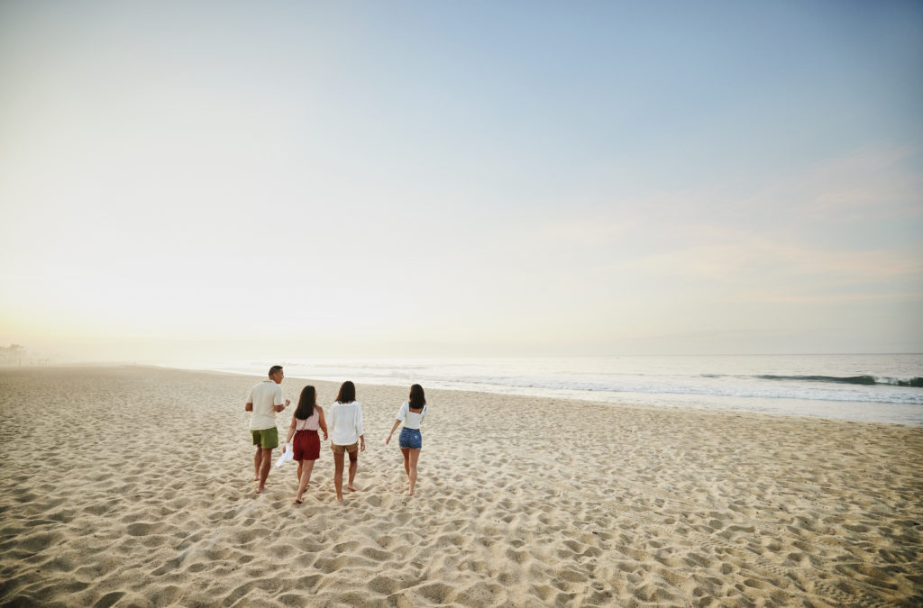 Extreme wide shot rear view of family walking on tropical beach at sunrise during vacation