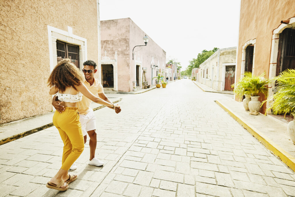 Wide shot of smiling couple dancing in street while exploring town during vacation