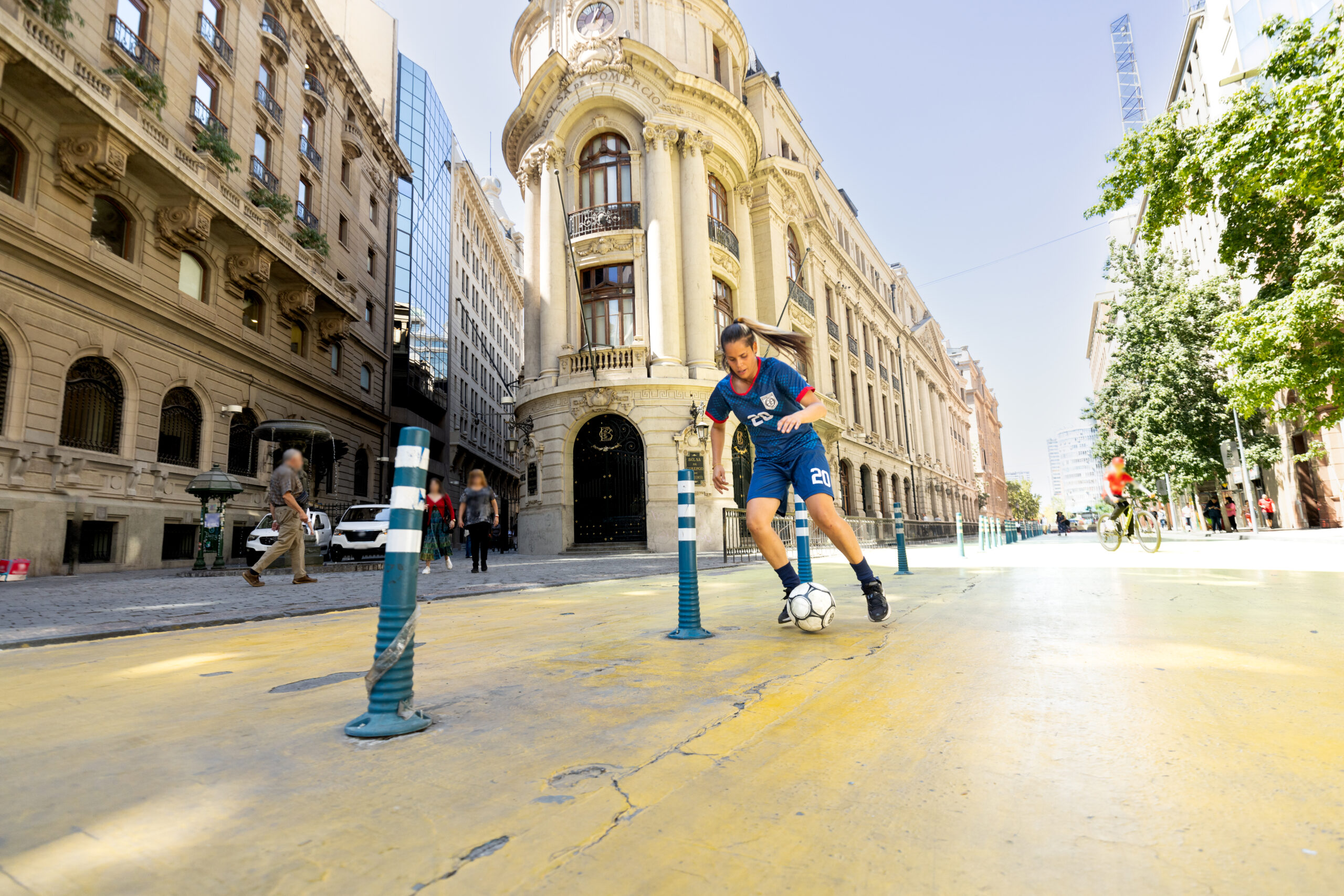 Wide shot of talented female soccer player kicking ball through bustling streets of Santiago, Chile