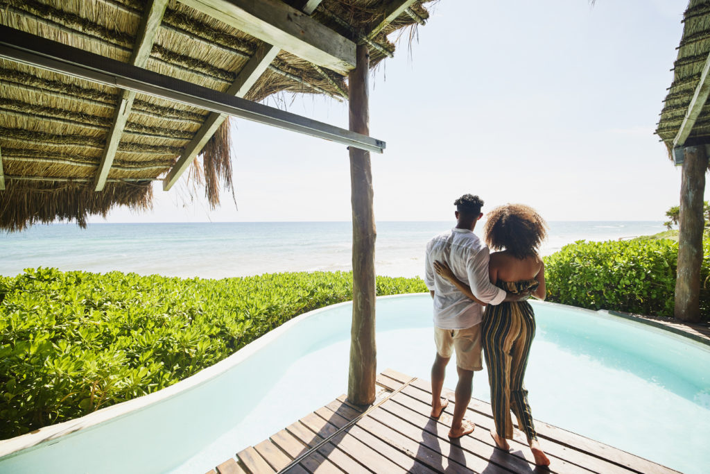 Wide shot rear view of couple standing poolside at luxury tropical beachfront villa looking at view ID: 68615 -1