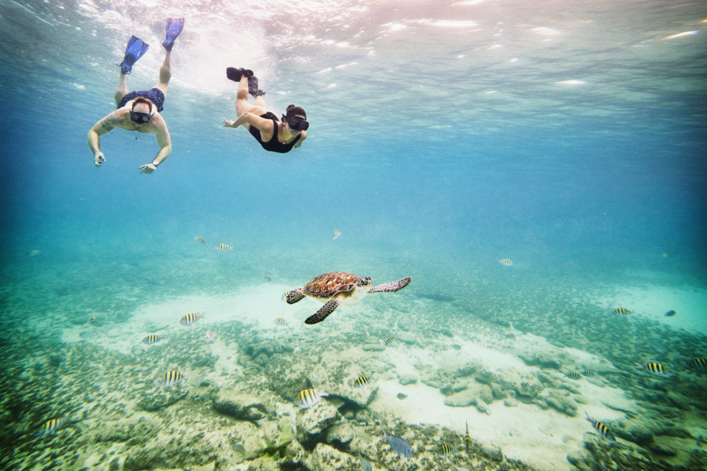 Wide shot underwater view of couple snorkeling near sea turtle swimming in tropical sea