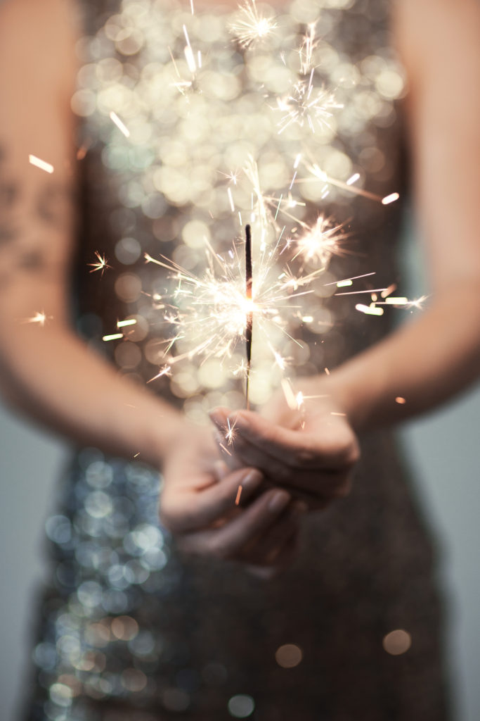 woman in glitter dress holding sparkler, close up hands, romantic look, can be used as background