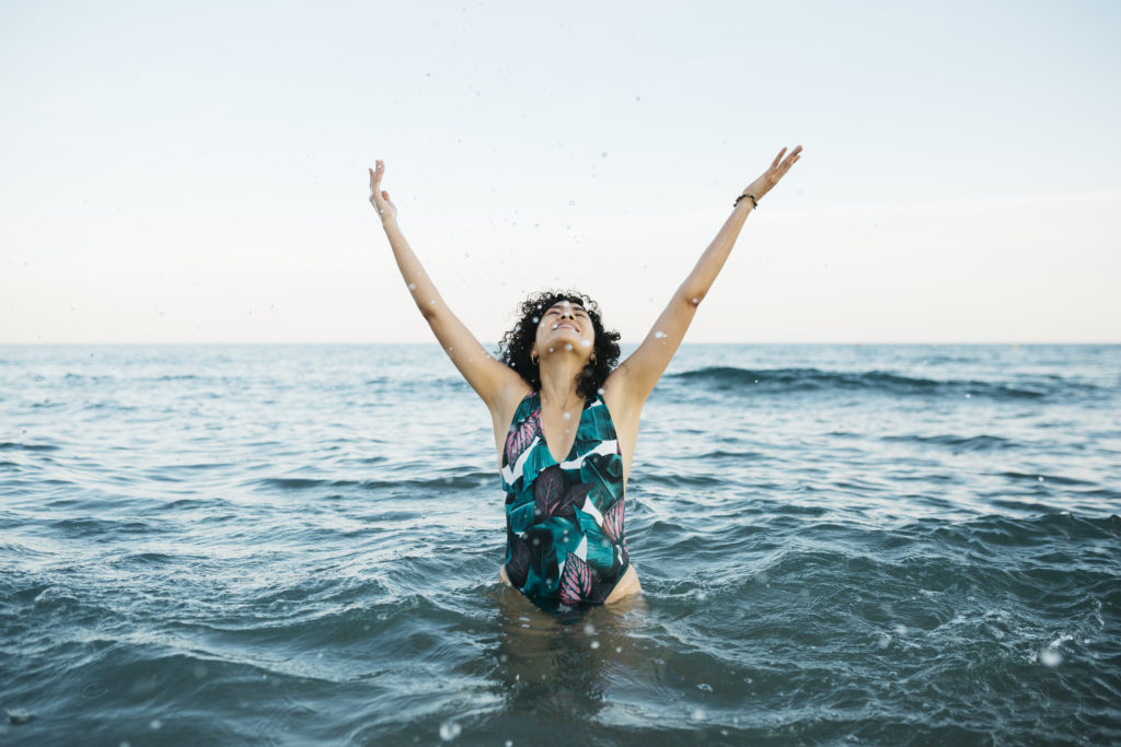 Woman in the sea splashing water ID: 69447 Young latin woman wearing swimsuit in the sea splashing water to the air