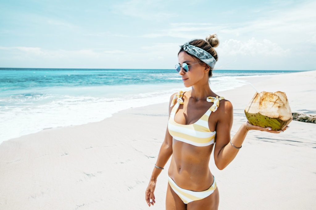 woman in yellow bikini and sunglasses drinking fresh coconut juice