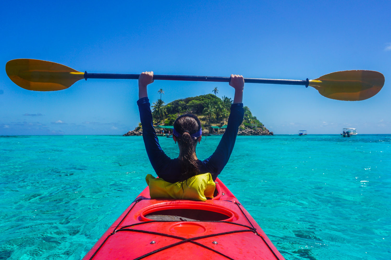 Woman lifting her paddle reading to Crab Cay (Cayo Cangrejo), Providence Island (Isla de Providencia), Colombia
