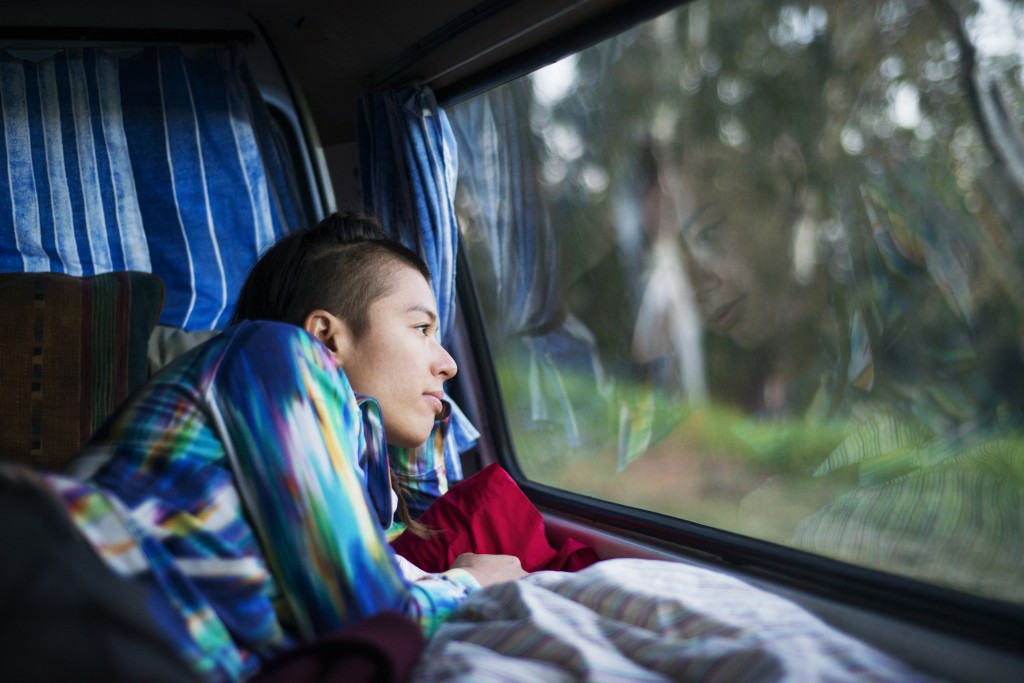 Woman lying in back of camper van and gazing out the window