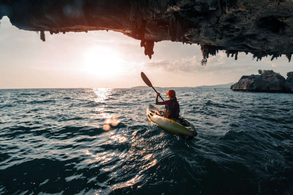 Woman paddles kayak in the tropical sea at sunset and passes the limestone mountains with stalactites