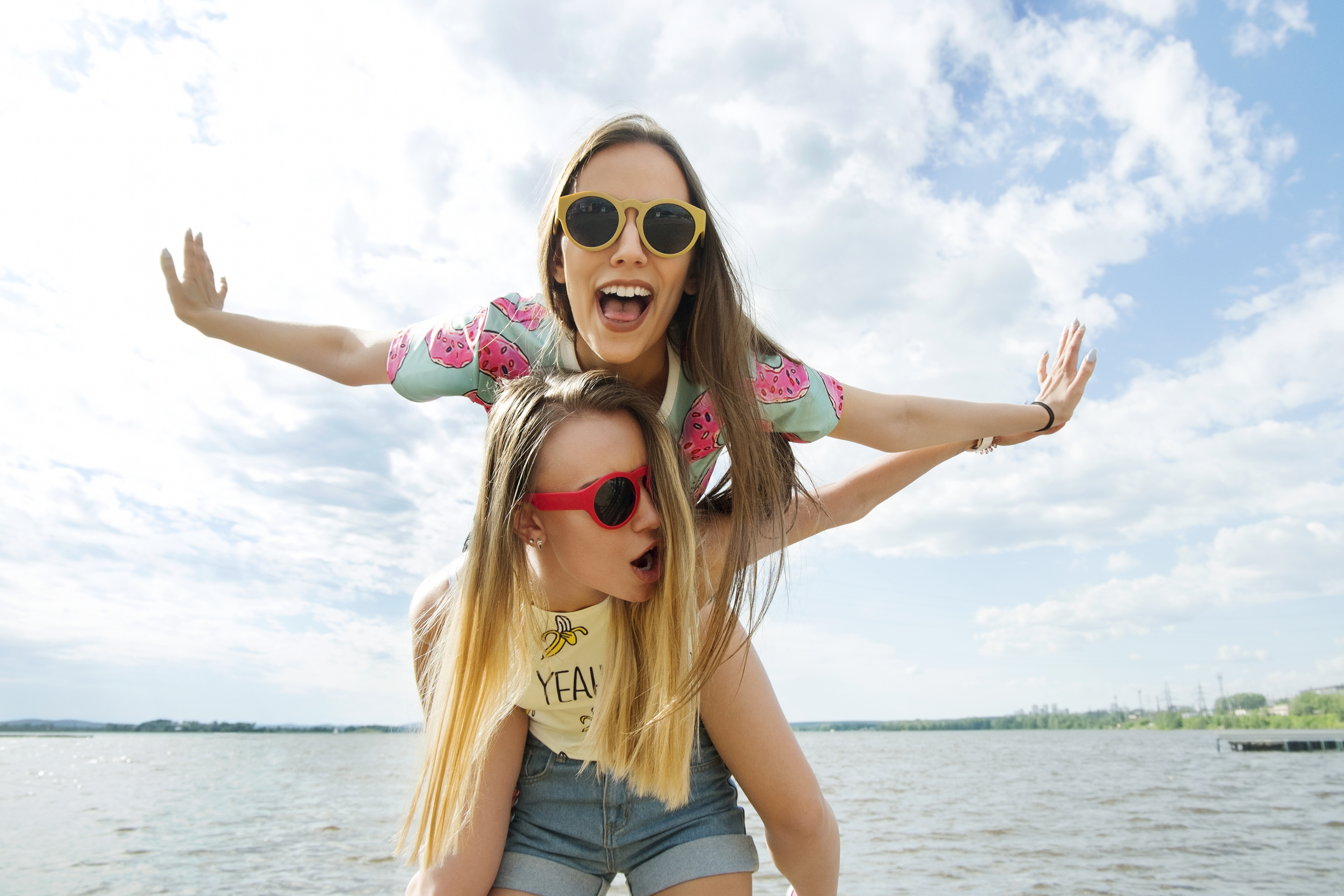 Woman piggybacking friend against sky