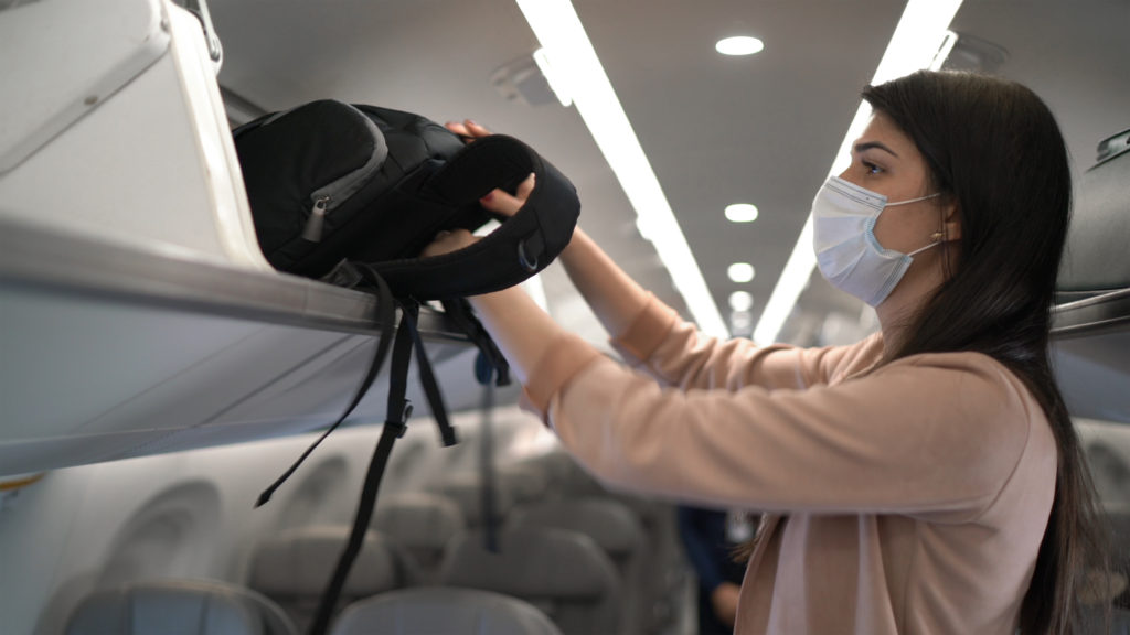 Woman putting suitcase in the open log of the airplane cabin wearing face mask