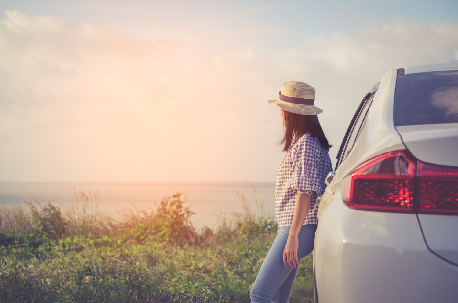 Woman standing with white car at sunset and beautiful view with vintage tone