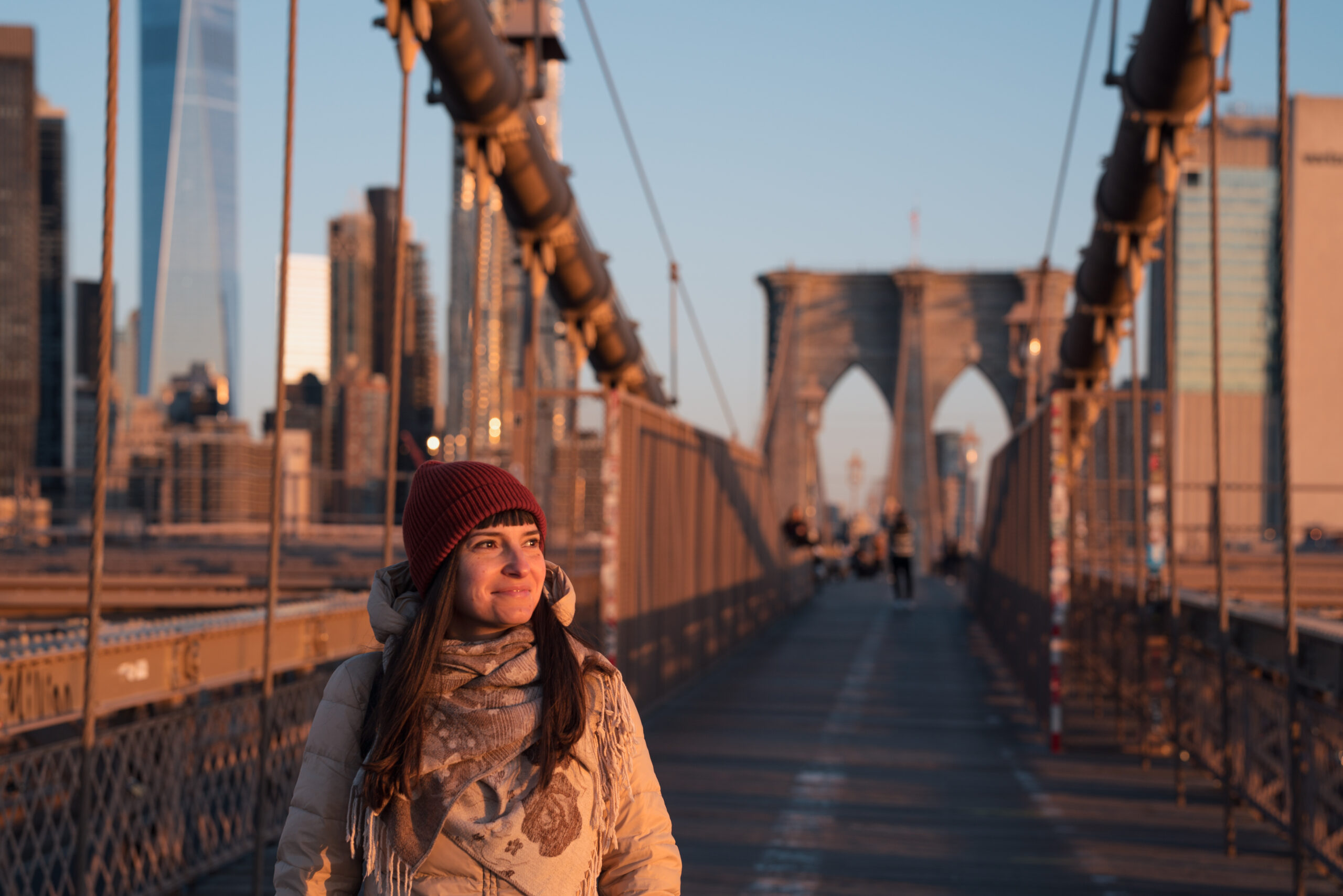 Woman tourist at Brooklyn Bridge, New York City, USA ID: 75096 Woman tourist watching Brooklyn Bridge, New York City, USA
