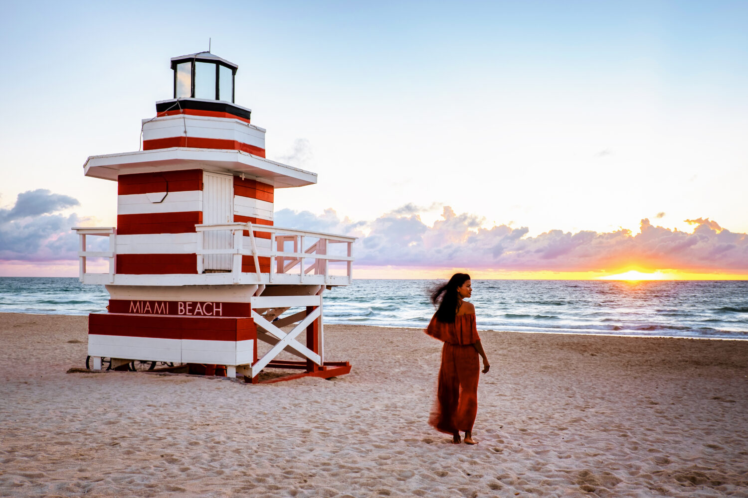 woman walking on the beach Miami, a colorful beach in Miami Florida during sunset