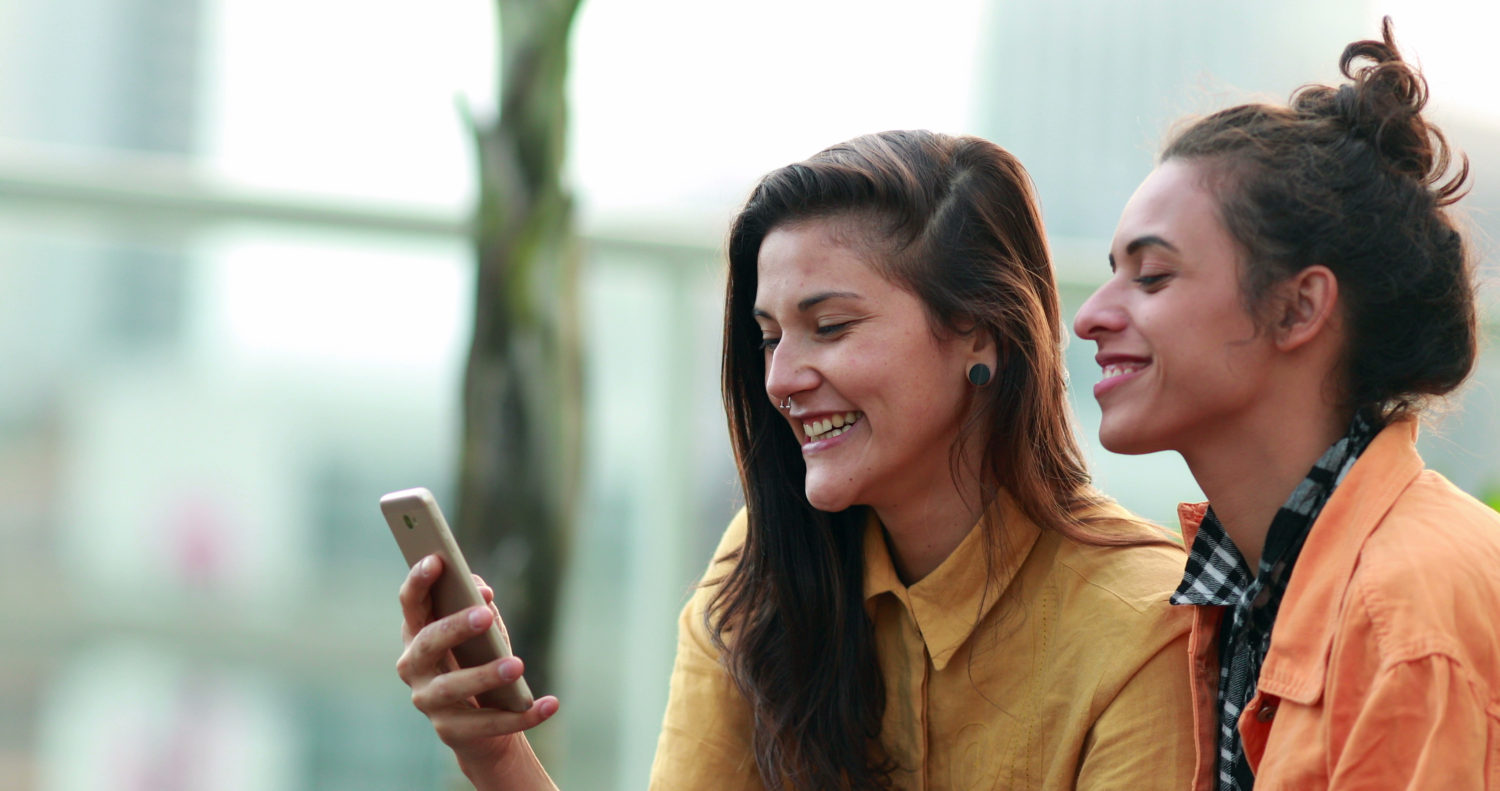 Women reaction laughing out loud. Two young women laughing together to content on phone