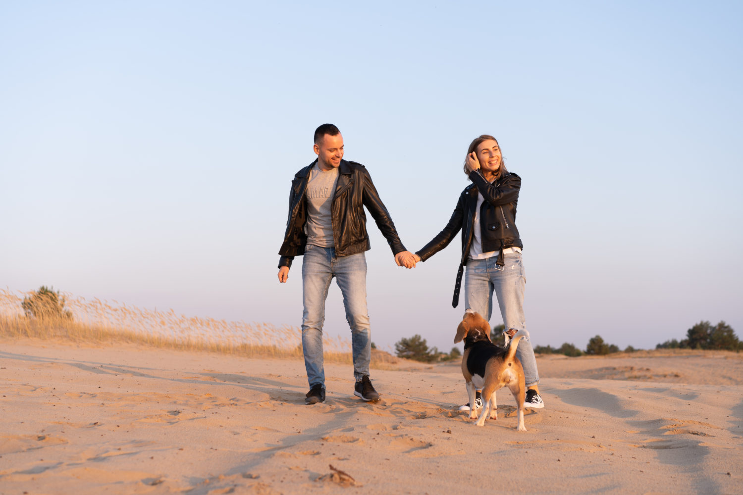Young beautiful caucasian couple wearing leather jacket and jeans walks desert sand with Beagle dog best friend. Family with dog without children resting in nature. positive emotions happy people