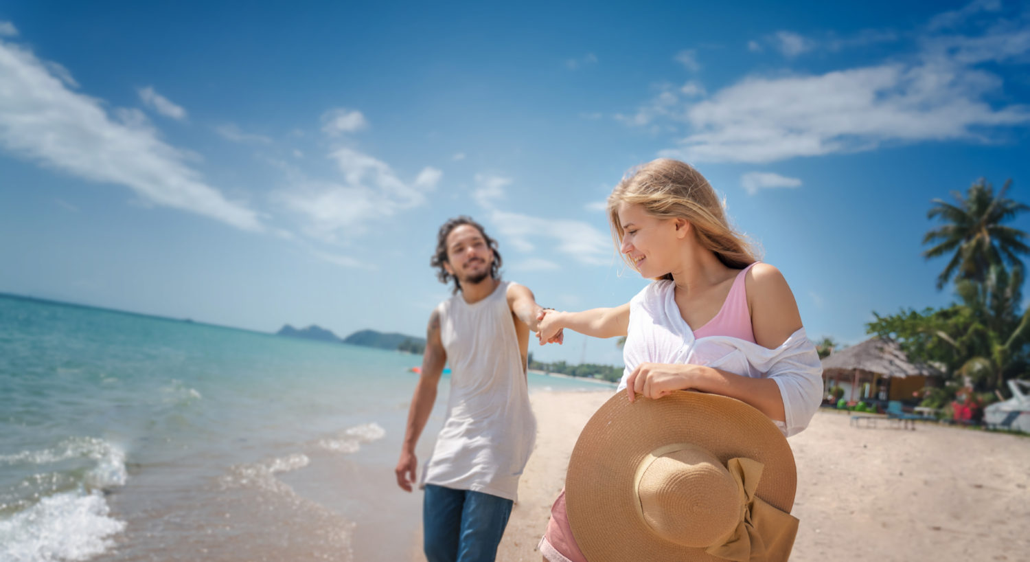 Young beautiful couple in love walks on a tropical beach, woman blonde and brunette man, happiness vacation travel concept