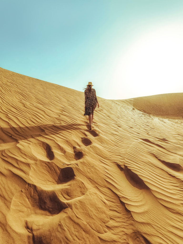 Young beautiful woman in a long dress walks along the sand dunes of the Dubai desert