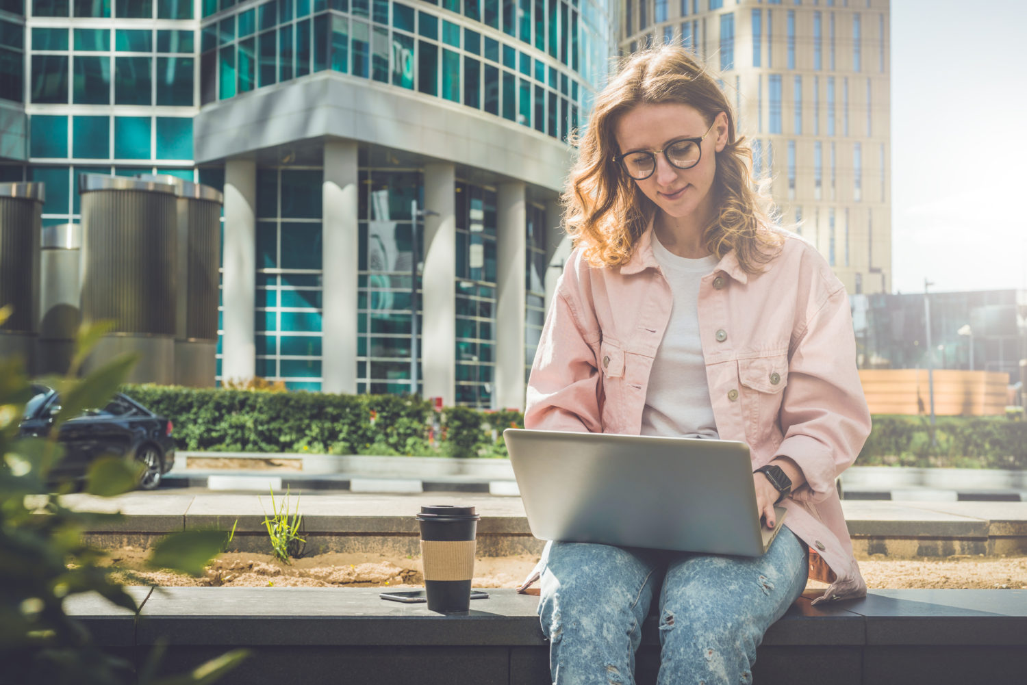 young business woman in glasses sits outdoor and uses laptop
