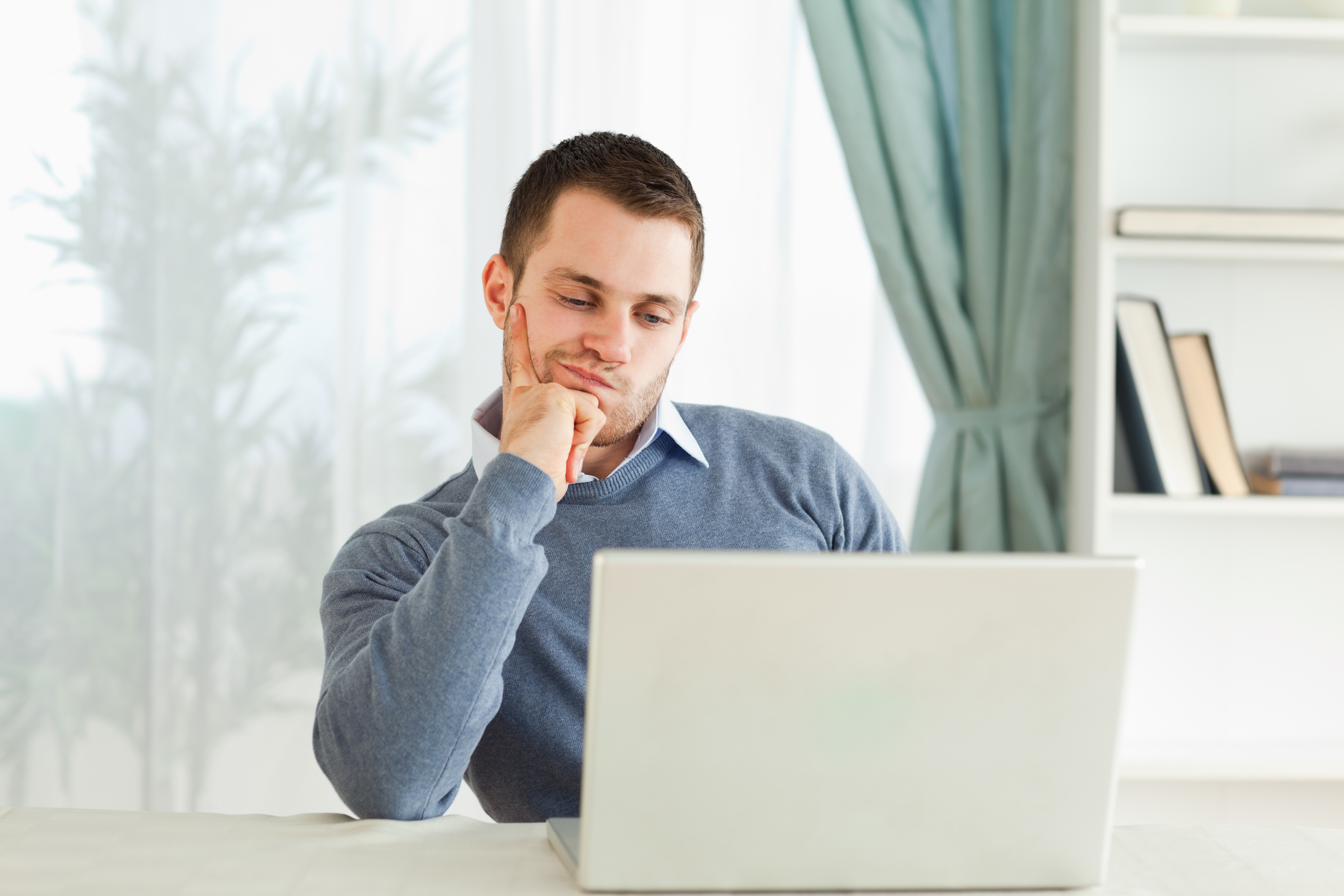 Young businessman on his laptop in thoughts in his home office. Working from home in quarantine lockdown. Social distancing Self Isolation