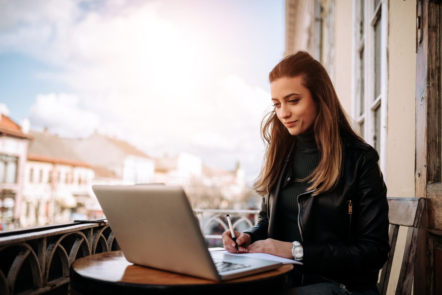 Young bussines woman working outdoors. Writting in a notebook while sitting in front of a laptop.