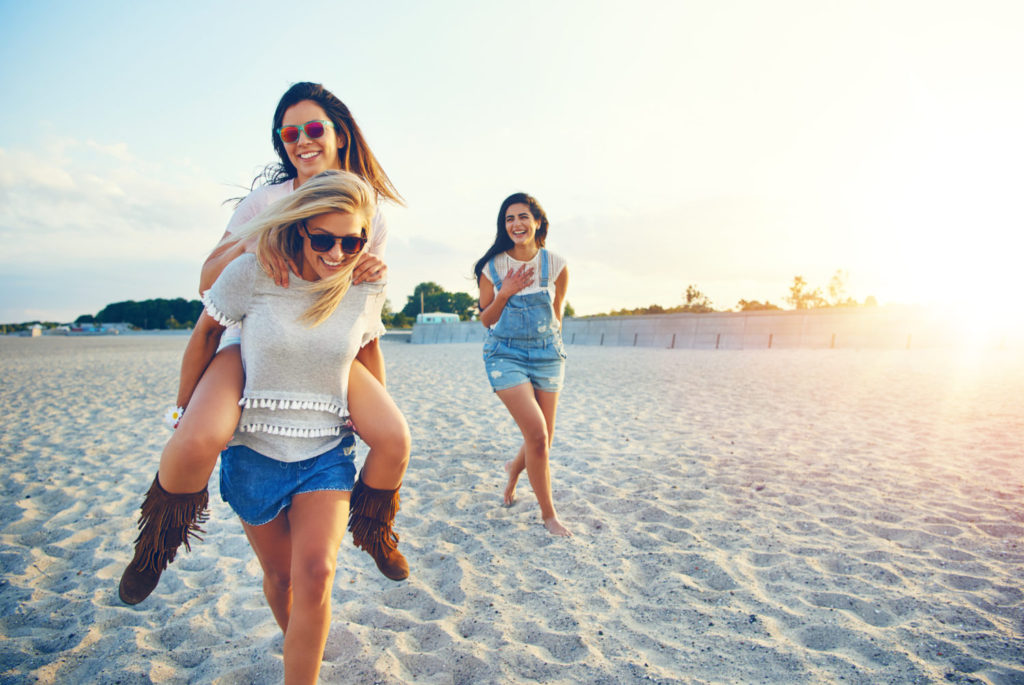 Young cheerful girl giving her friend piggyback ride while third girl laughing at them.