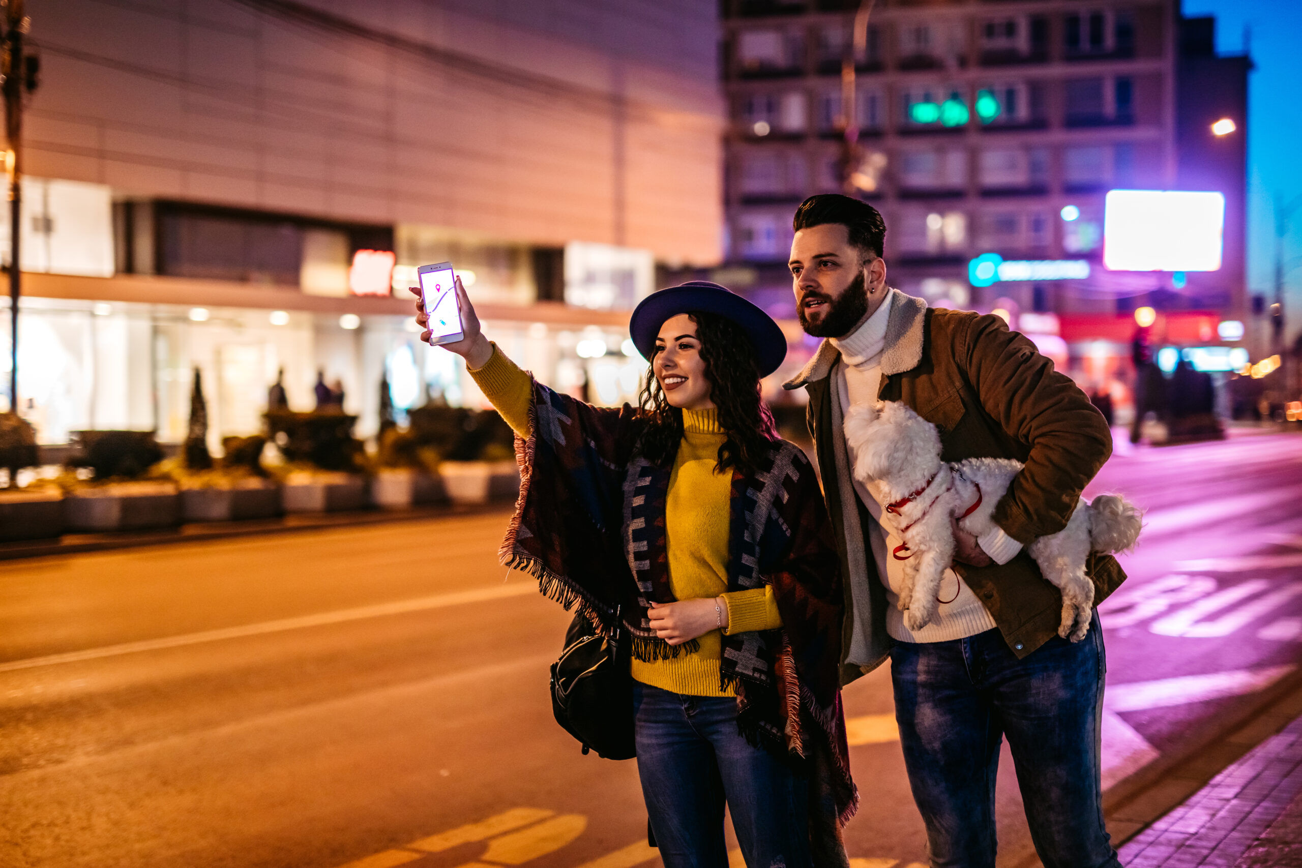 Young cute heterosexual couple with bichon dog calling crowdsourced taxi downtown.