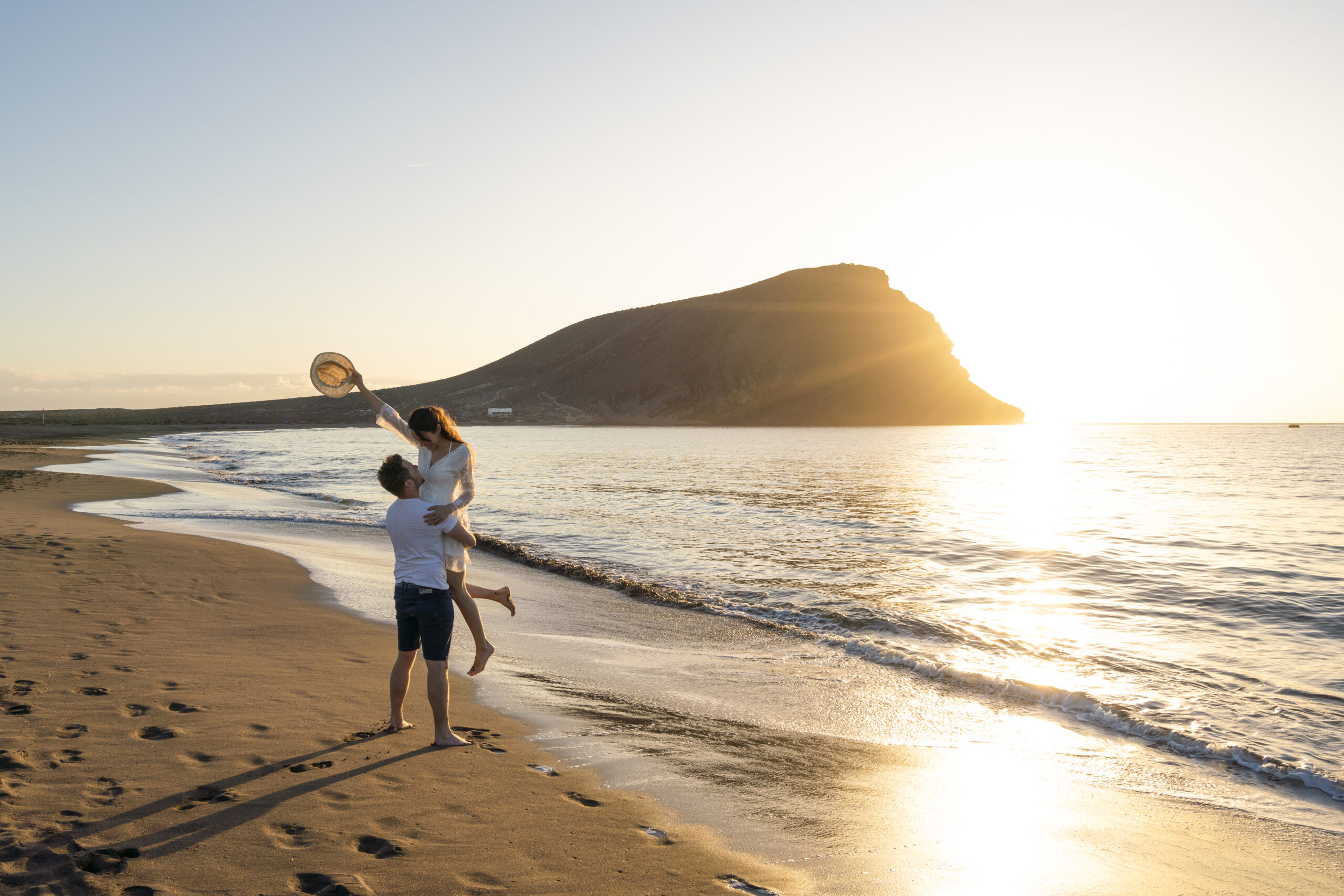 Young couple having fun at beach La Tejita, Tenerife, Canary Islands