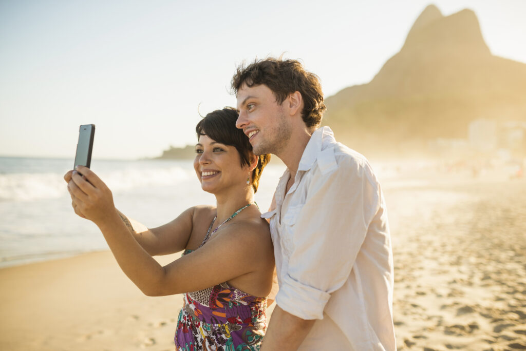 Young couple self-photographing, Ipanema Beach, Rio, Brazil