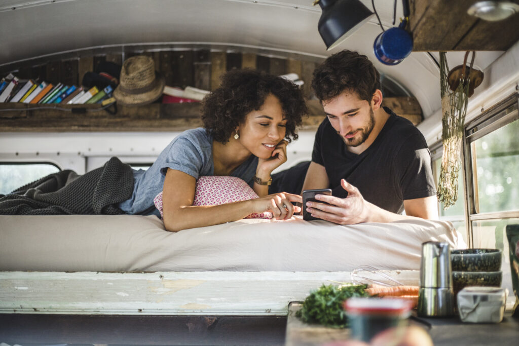 Young couple sharing smart phone while lying on bed in caravan