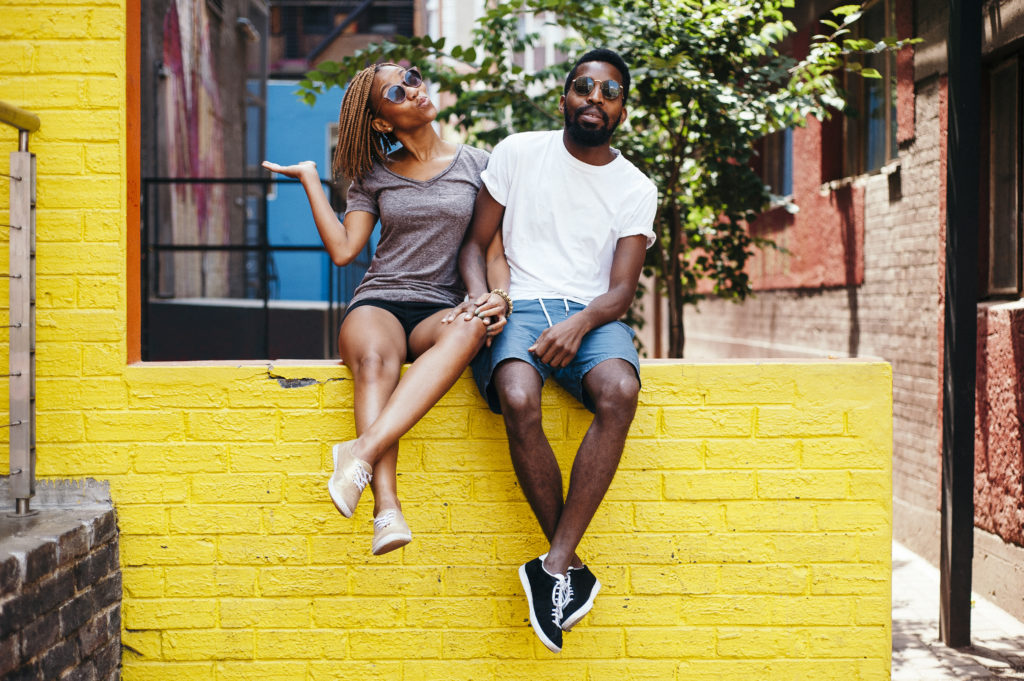 Young ethnic African couple sitting on wall in trendy suburb in Braamfontein Johannesburg South Africa