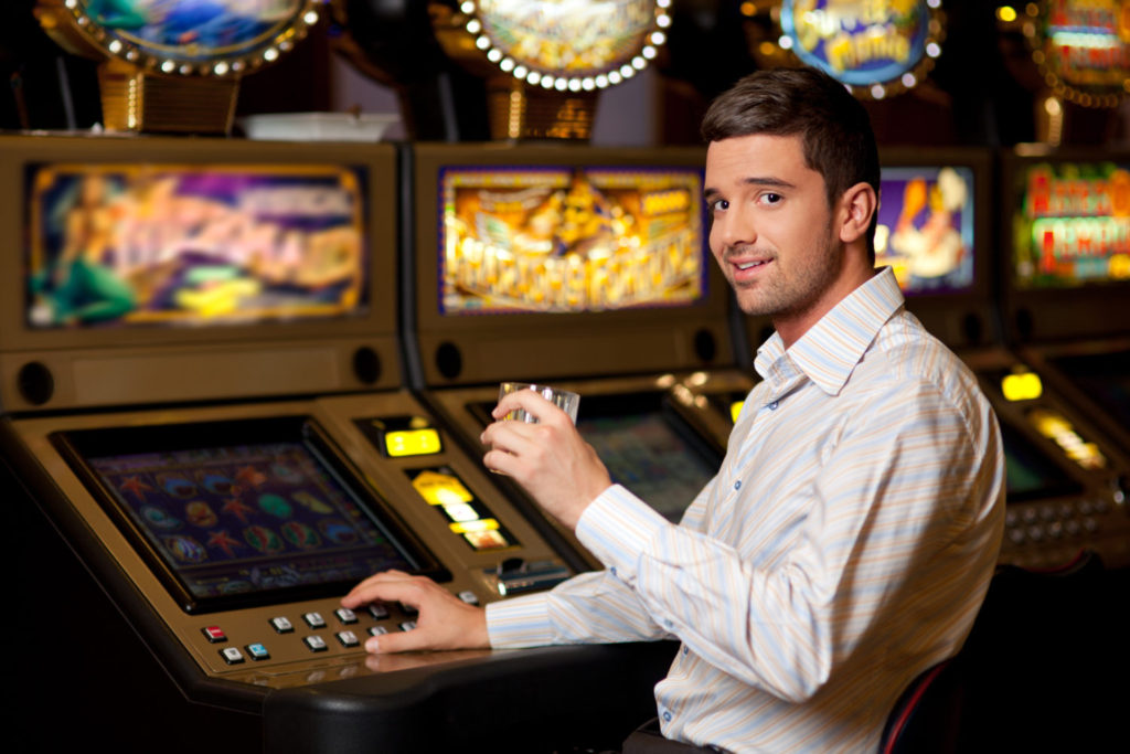 young handsome man playing the slot machine holding drink ID: 47955 young handsome man playing the slot machine holding drink