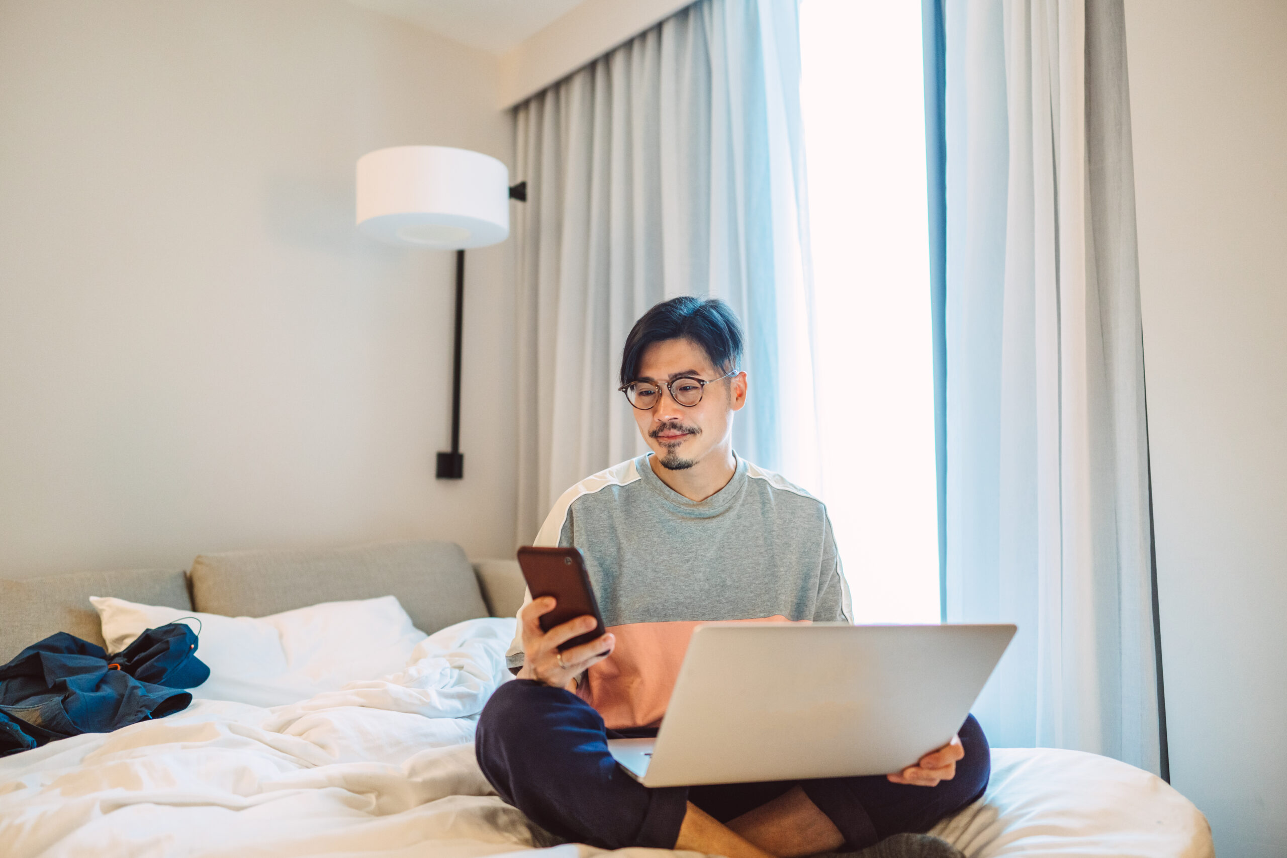 Young handsome man using his smartphone while working from his laptop on bed during pandemic quarantine in hotel room.
