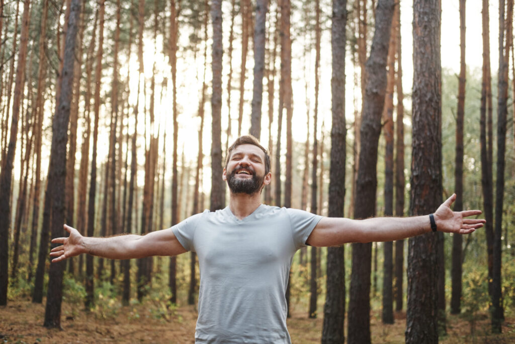Young happy Caucasian male in the forest. He spread his arms and closed his eyes. Wellness concept and holistic rest