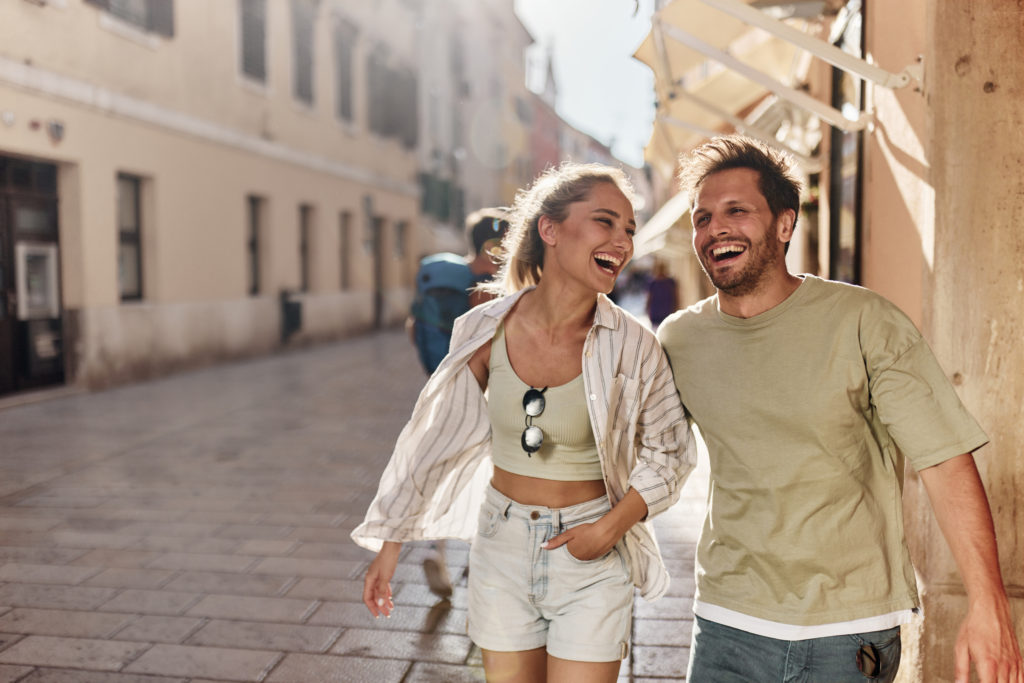 Young happy couple enjoying in walk on the street. ID: 70051 Happy couple taking a spring walk on the city street. Copy space.