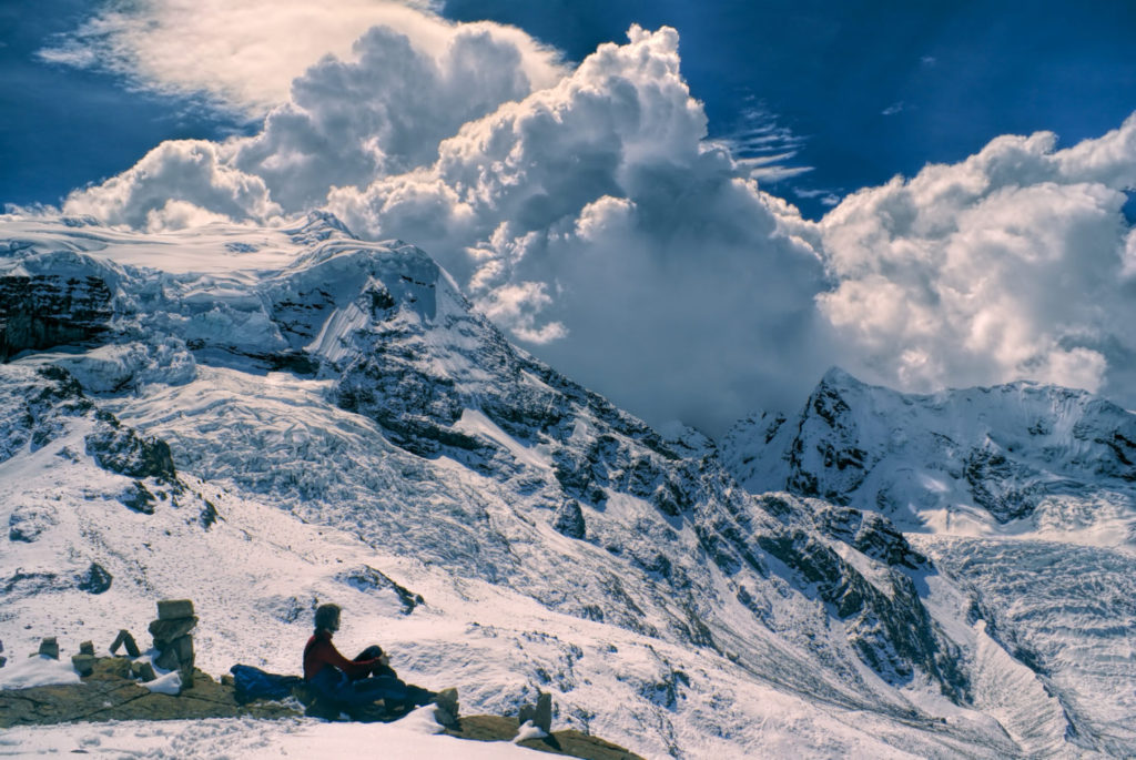 Young hiker sitting in south american Andes in Peru, Ausangate with dramatic clouds forming above the mountains