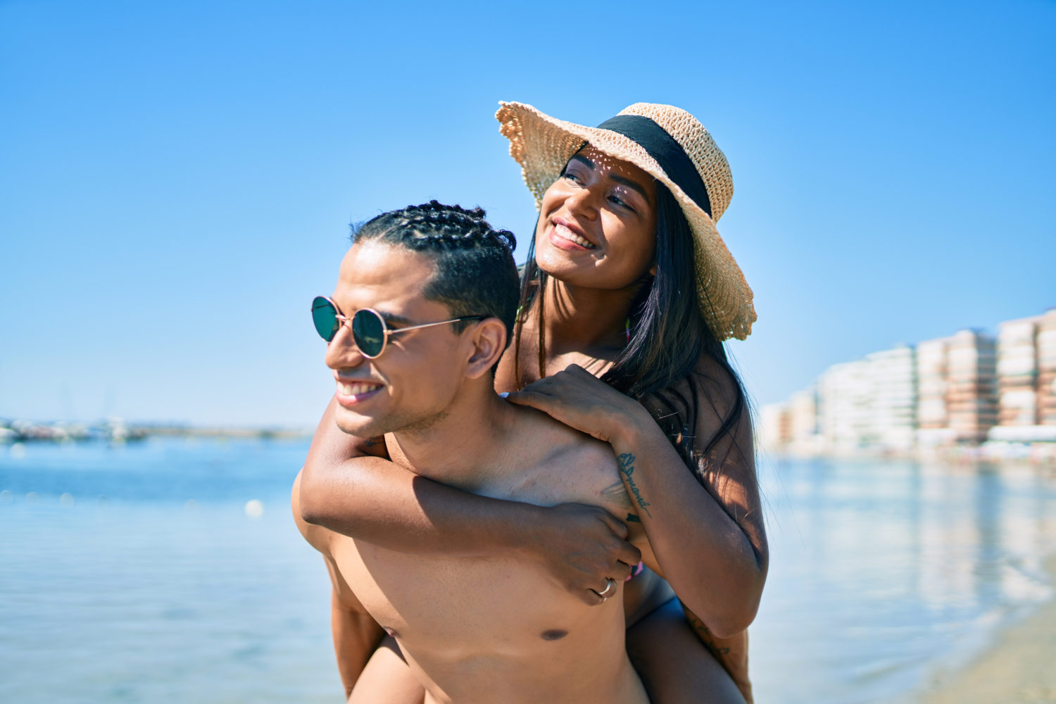 Young latin couple wearing swimwear smiling happy walking at the beach.
