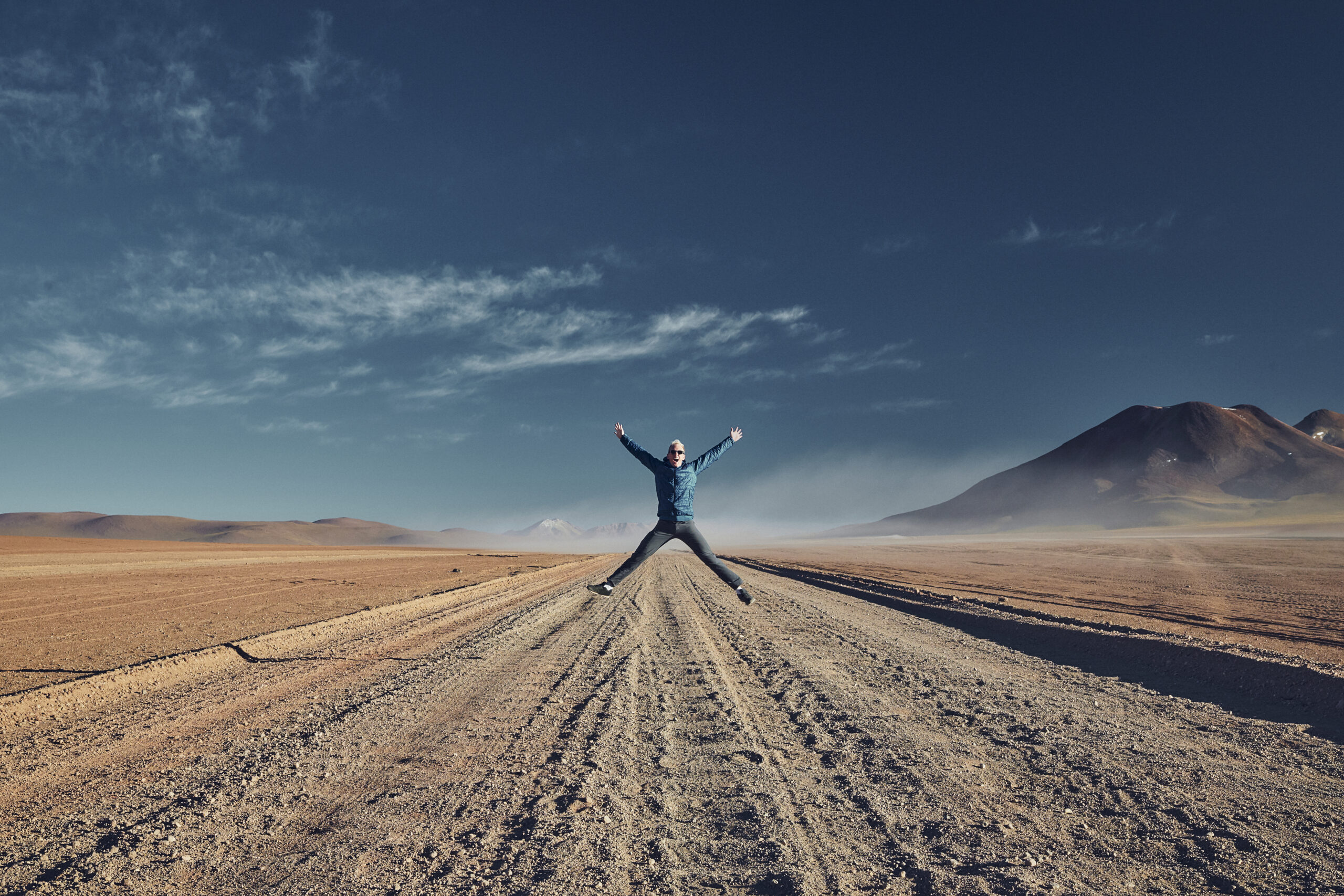Young male tourist star jumps with excitement in Atacama Desert ID: 78768 Beautiful early sunlight illuminates the Mars-like mountainous landscape