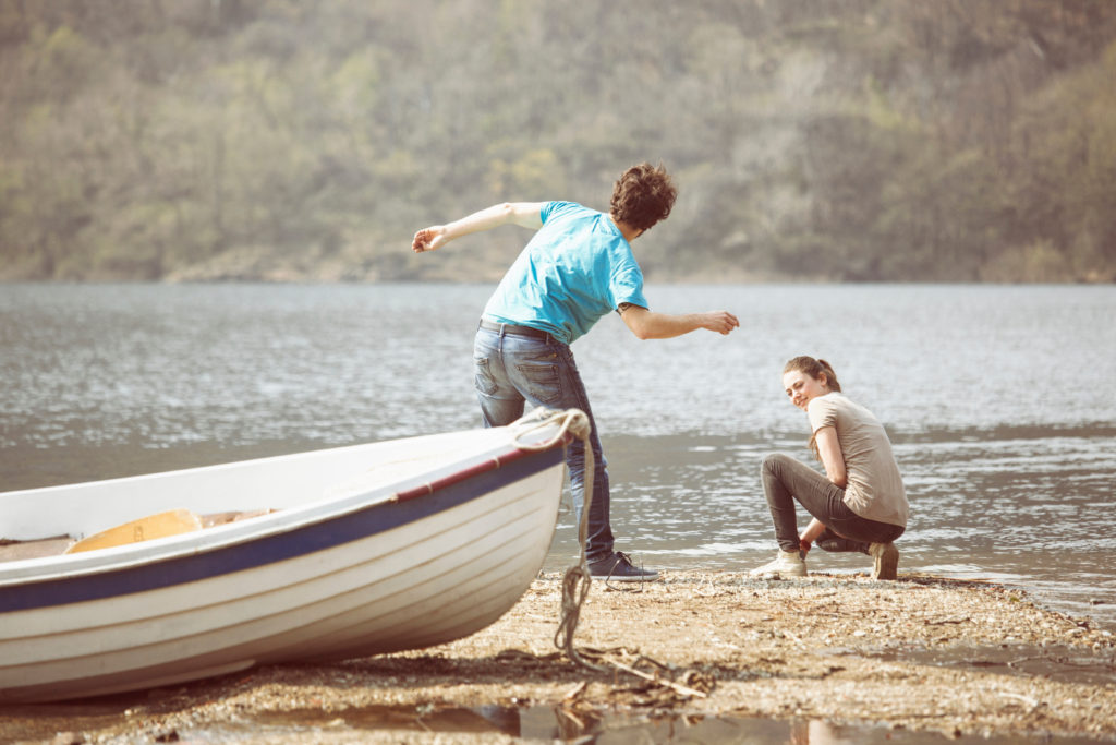 Young man and girlfriend skimming stones in Lake Mergozzo, Verbania, Piedmont, Italy