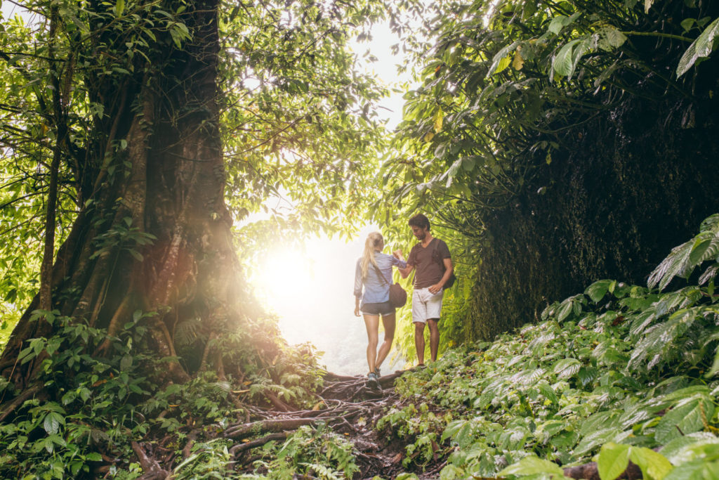 Young man and woman hiking in tropical jungle. Couple of hikers walking along forest trail.
