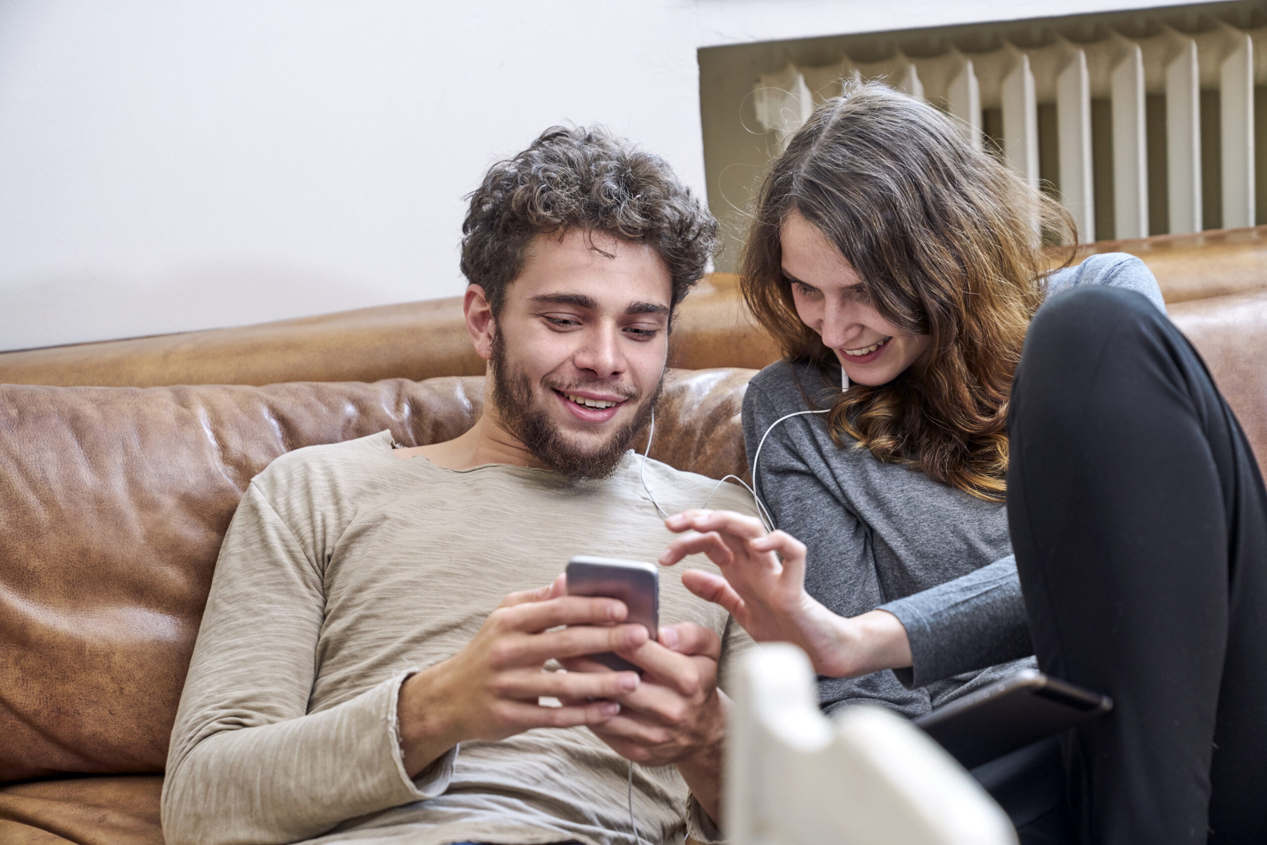 Young man and young woman sitting on couch sharing cell phone and earphones