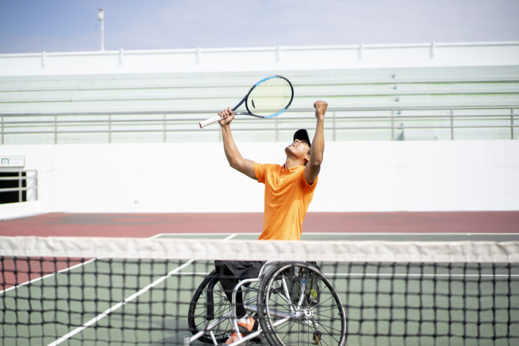 Young man in a wheelchair plays tennis in the Victory Tennis Court.