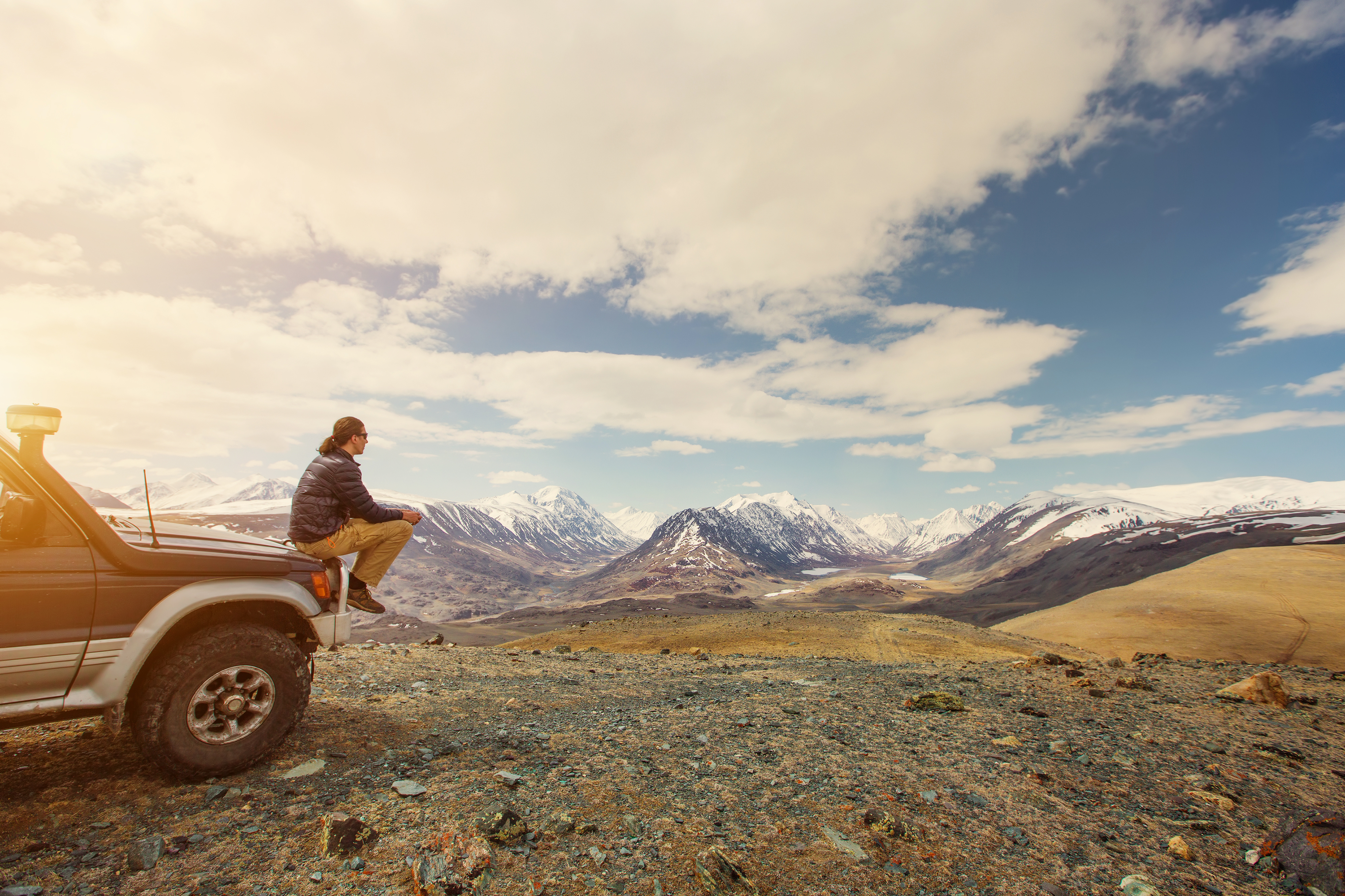 Young man sitting on his car in beautiful mountains landscape. Off-road travel vacation, enjoy freedom