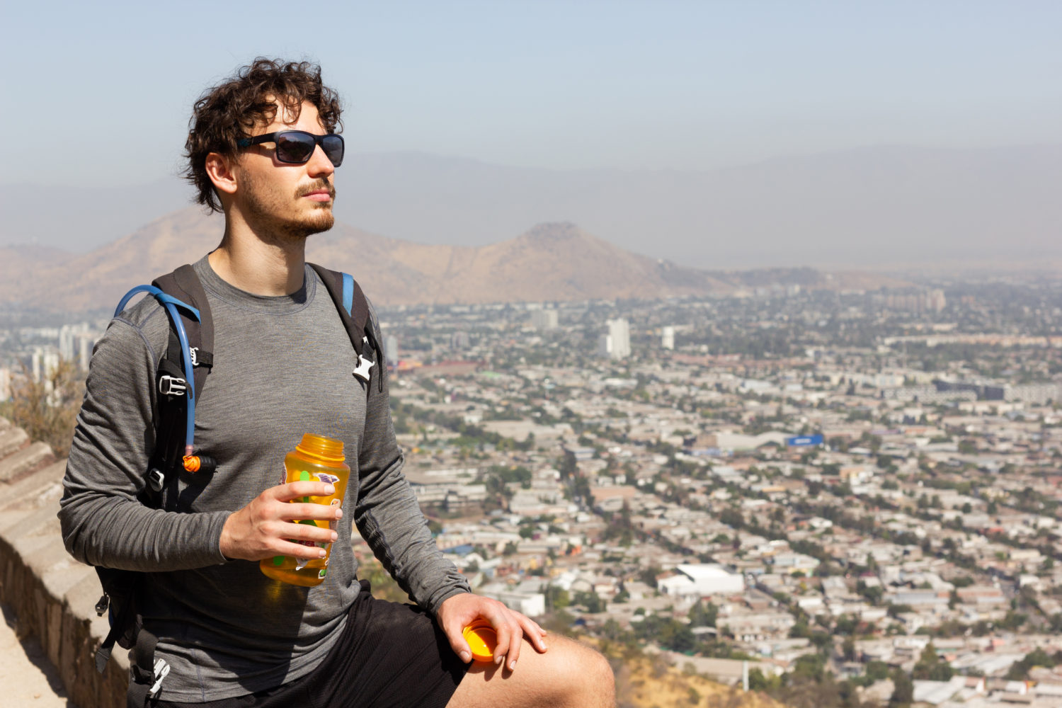 Young man with sunglasses holding water bottle and enjoying splendid views of Santiago city in Chile on sunny day. Hiker taking a break while trekking